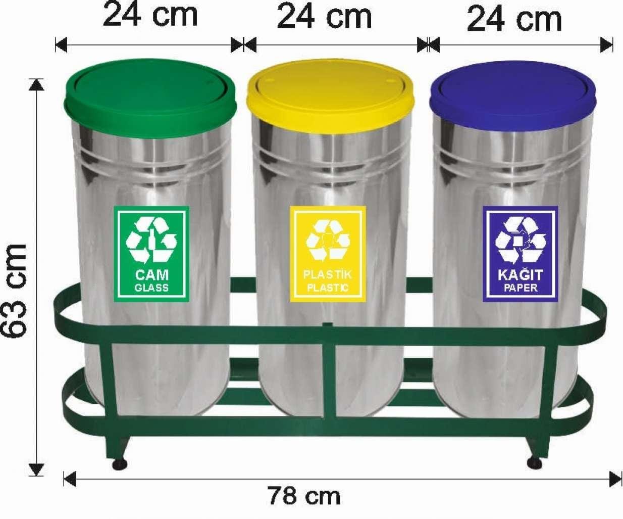 • Paslanmaz Çelik Geri Dönüşüm Kutusu (3 adet): Farklı malzemeleri (kağıt, plastik, metal) ayırmak için tasarlanmıştır.
