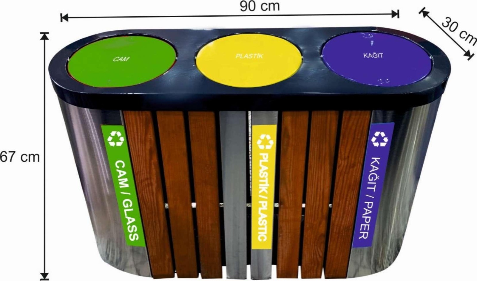 AHŞAPLI PASLANMAZ GERİ DÖNÜŞÜM KOVASI 3'LÜ 81 LT (METAL İÇ KOVALI, DÖNER KAPAKLI)