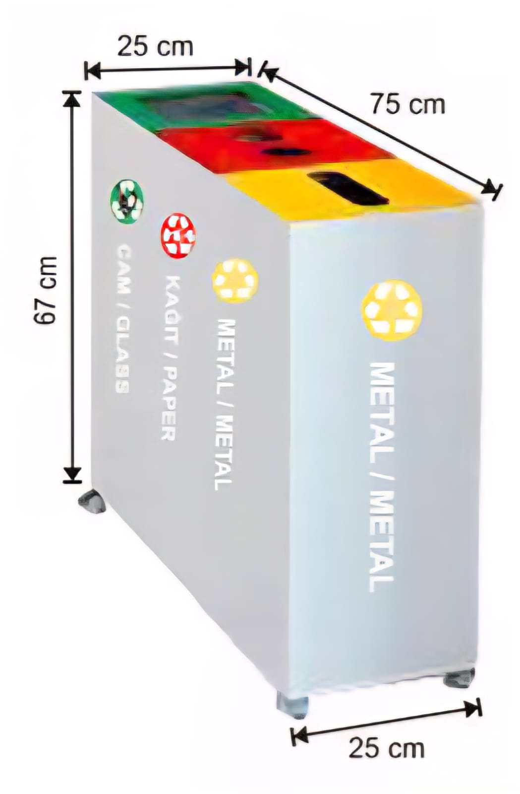 - 3 Farklı Renk: Her biri farklı bir atık türünü temsil eden üç ayrı kova, plastik, kağıt ve metal gibi geri dönüştürülebilir maddelerin ayrıştırılmasını kolaylaştırır. Renk kodlaması, geri dönüşüm süreçlerini hızlandırır.